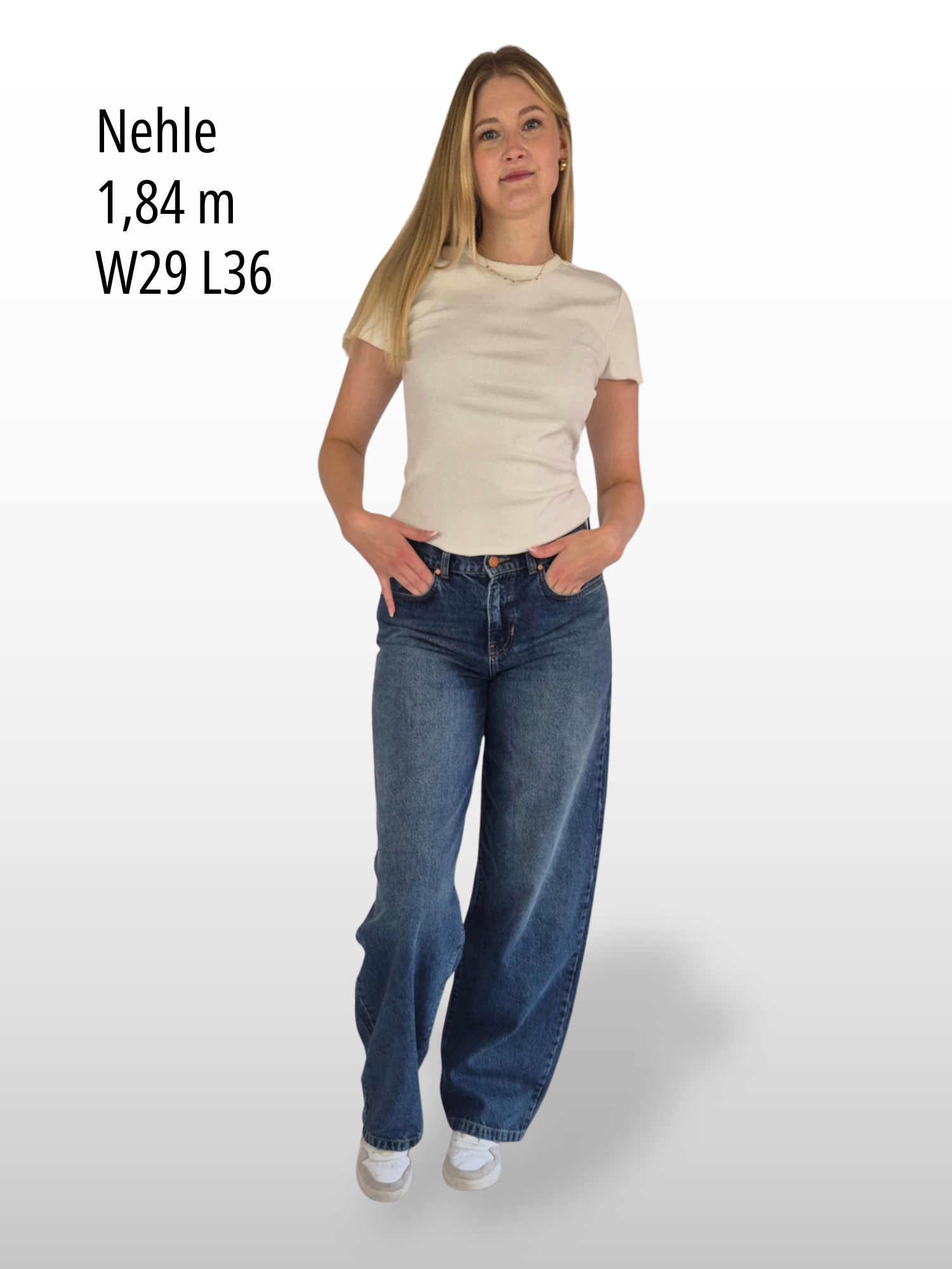 Model Nehle ist 1,84 m groß und trägt Weite 29 / Länge 36 mit einer Innenbeinlänge von 93 cm.