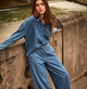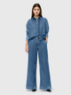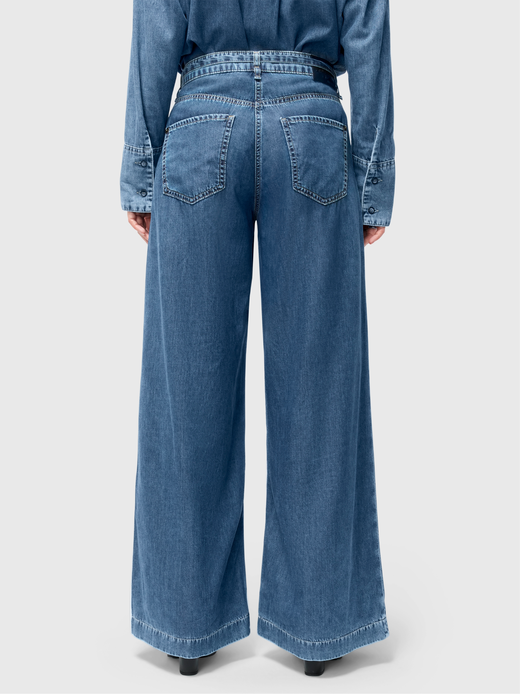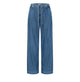 Der Bindegürtel verleiht der Hose einen lässigen, aber dennoch schicken Look, während das weit geschnittene Bein und die hohe Leibhöhe eine stilvolle Hommage an die 70er-Jahre darstellt. In einem coolen Blue-Denim-Farbton gehalten, ist diese Hose ein absolutes Must-have für die aktuelle Saison!