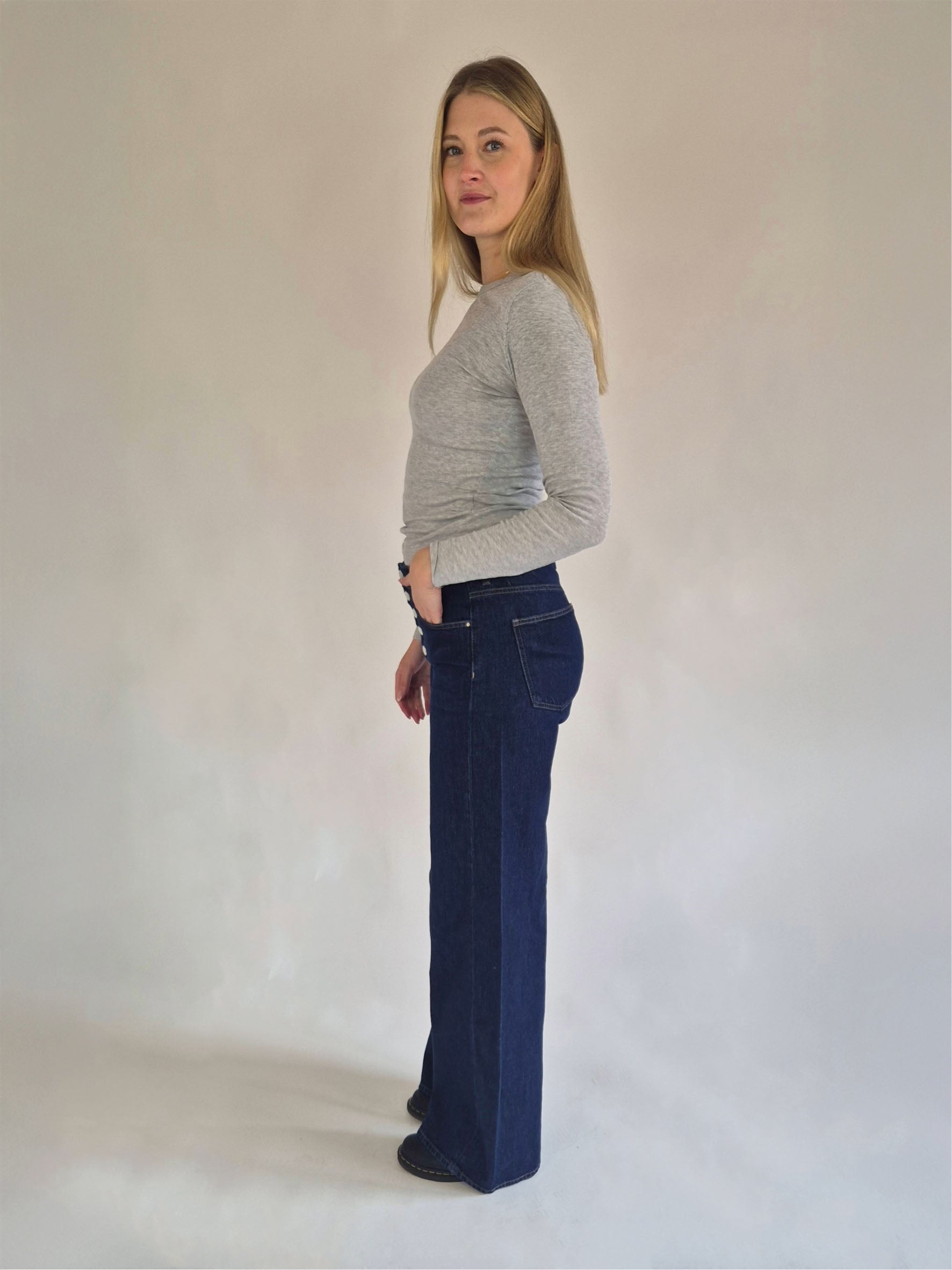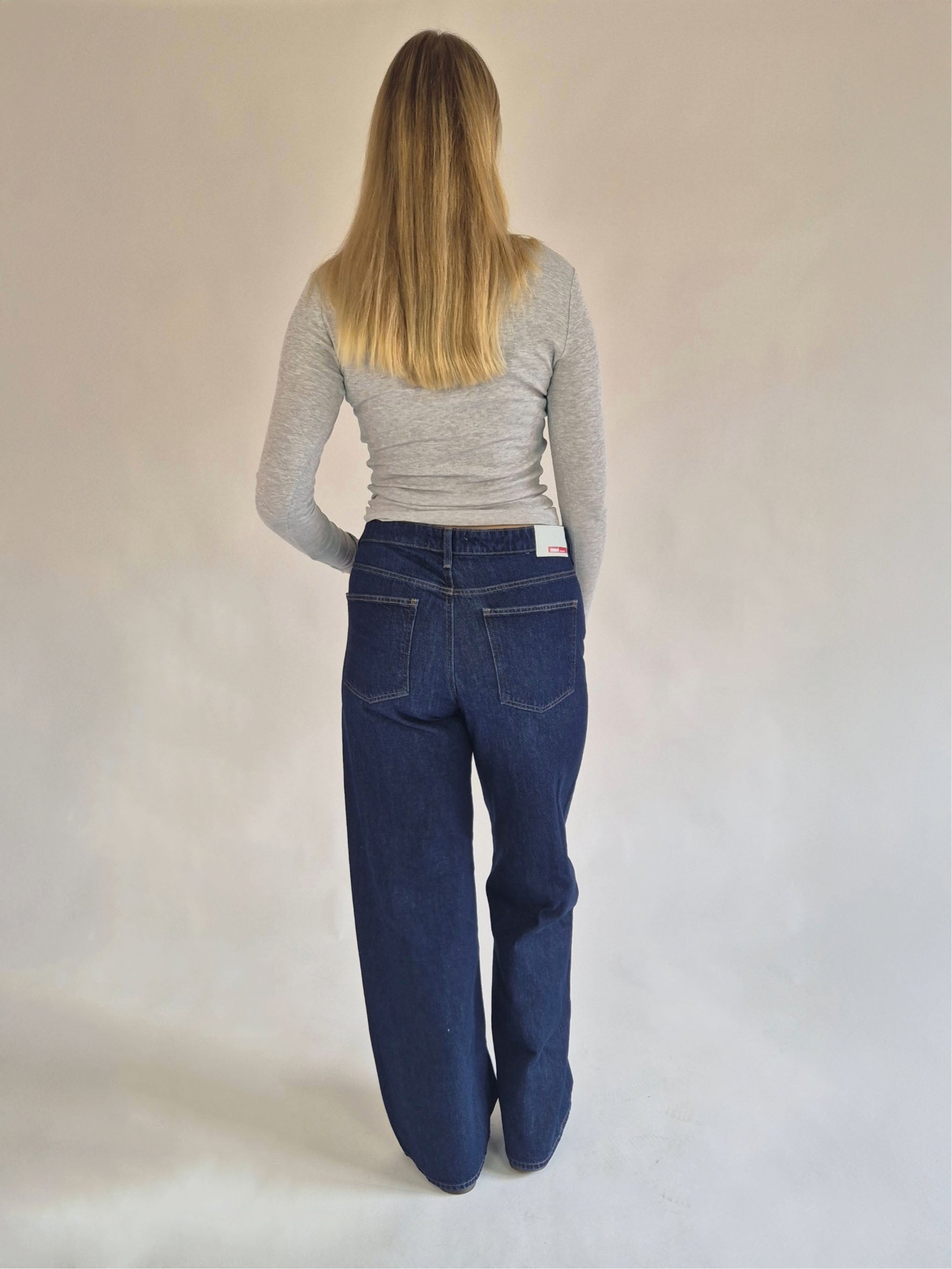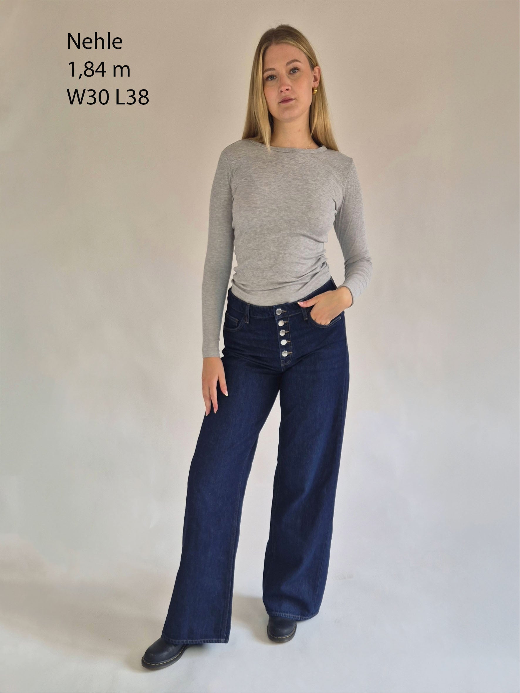 Extra lang geschnittene Wide Leg Jeans mit hoher Leibhöhe und weitem Beinverlauf.
