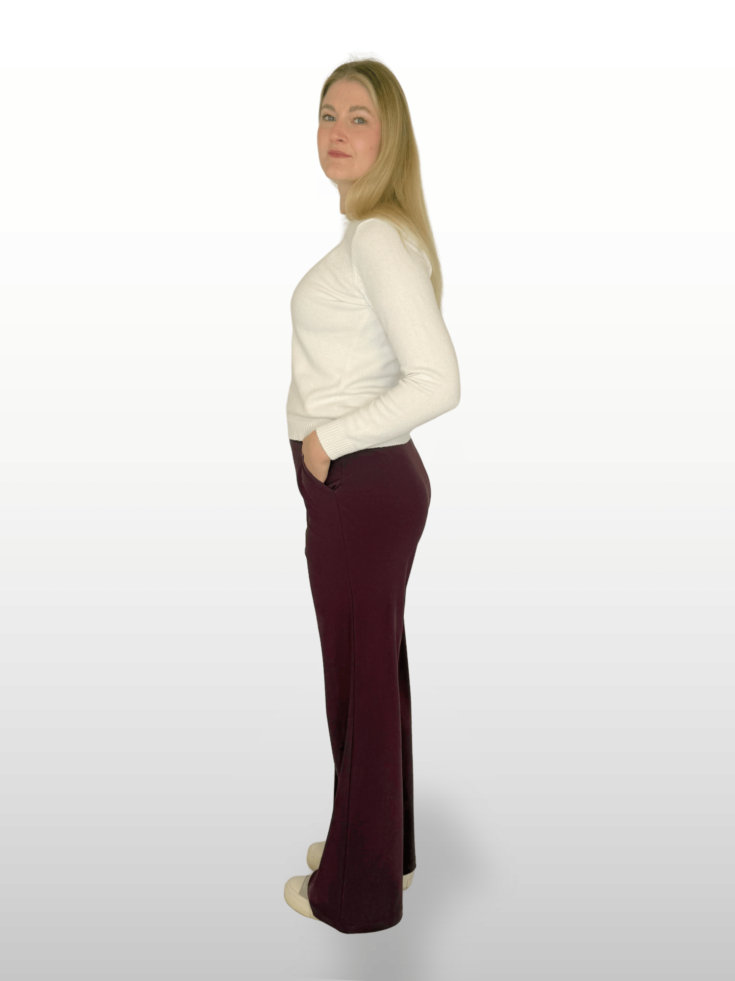 Model Nehle ist 1,84 m groß und trägt Größe 40 / L36 bei einer Innenbeinlänge von 95 cm. Die Passform ist locker, aber figurbetont, ideal für große Frauen, die Wert auf Stil und Komfort legen.