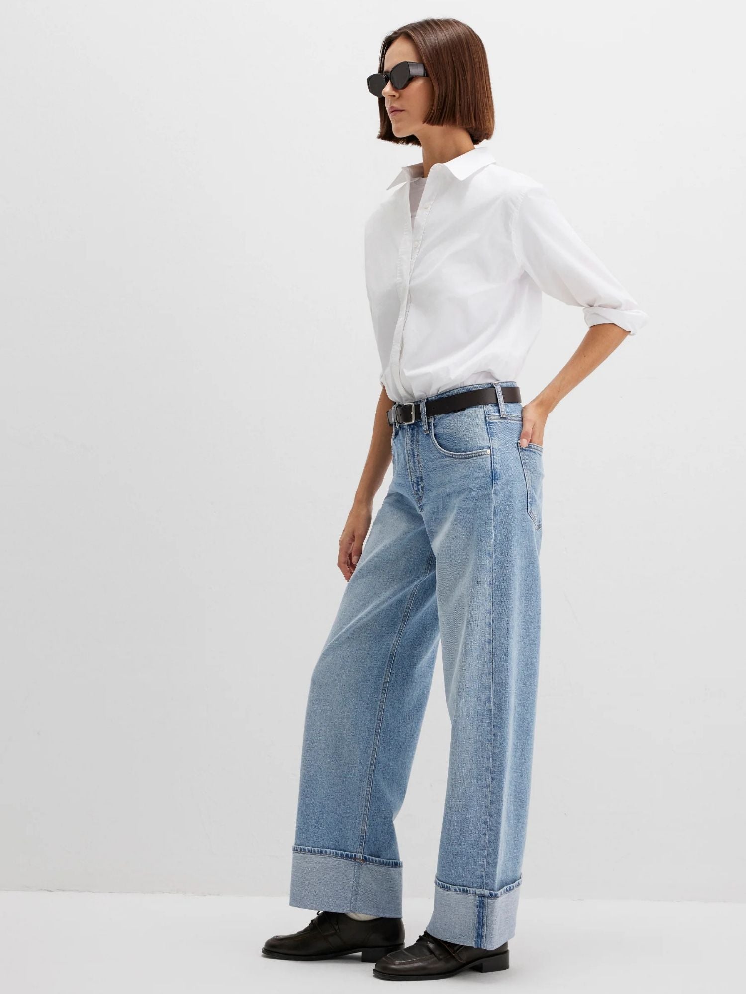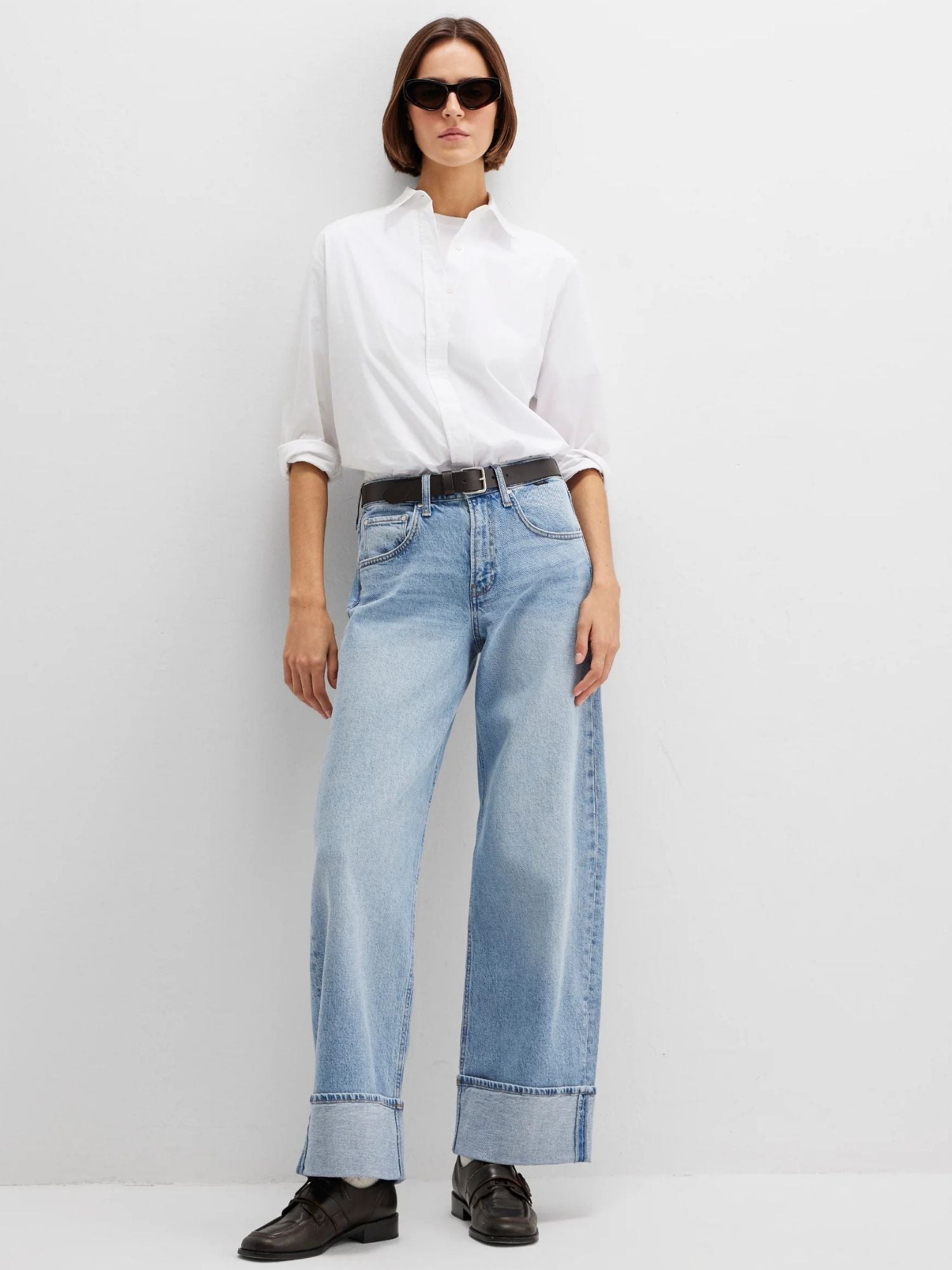 Der Wide-Leg-Schnitt sorgt für eine lässige, trendige Silhouette, während der dicke Umschlag am Fußende ein echtes Fashion-Statement setzt. Die helle blaue Waschung verleiht der Jeans einen frischen Look und macht sie zum vielseitigen Styling-Partner – ob casual mit Sneakern oder modern mit Sandalen und Absatzschuhen.