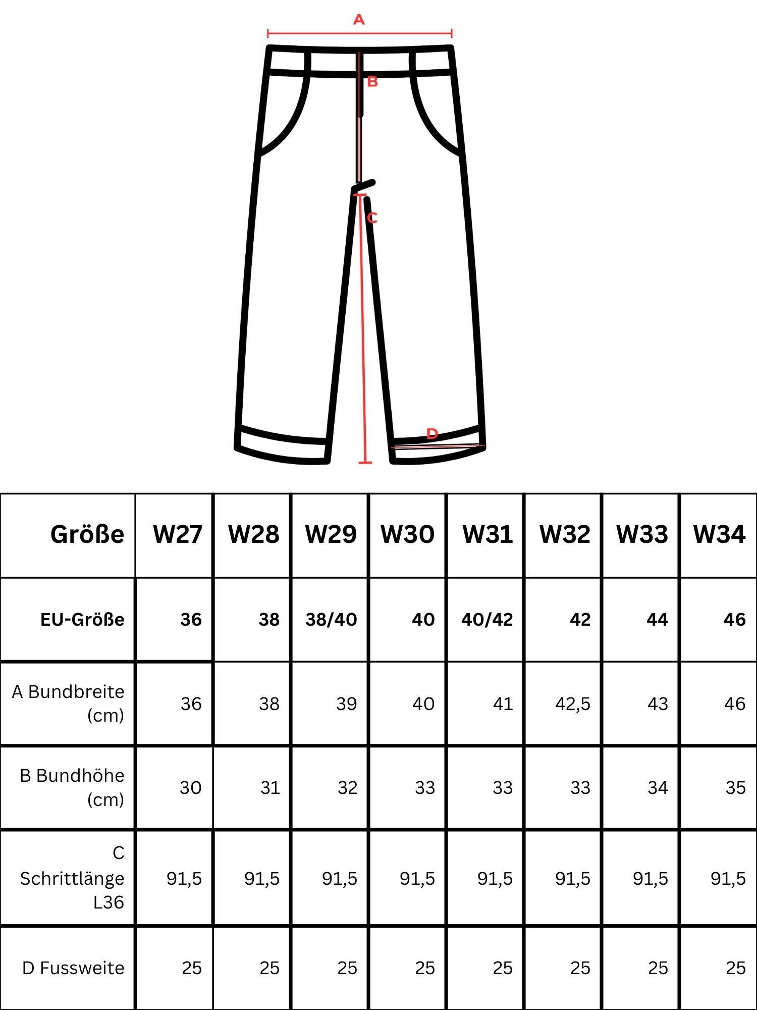 Das Model ist 1,84 m groß und trägt Weite 27 / Länge 36 mit einer Innenbeinlänge von ca 93 cm.
