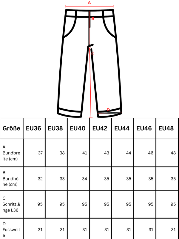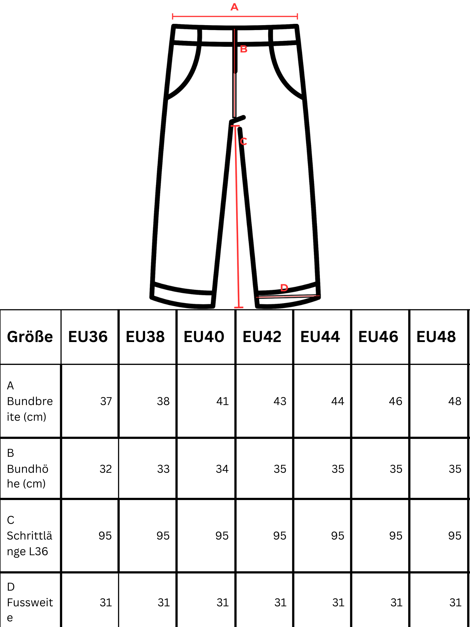 Längenhinweis: Länge 36 hat eine Innenbeinlänge von ca. 95 cm.
