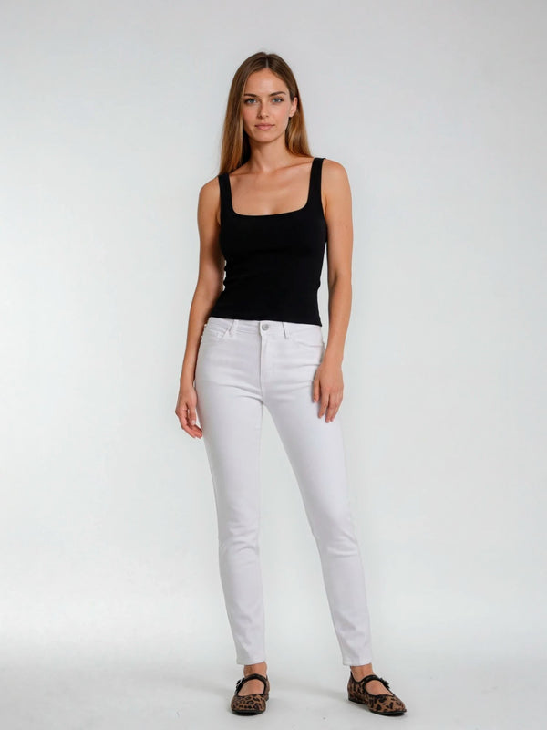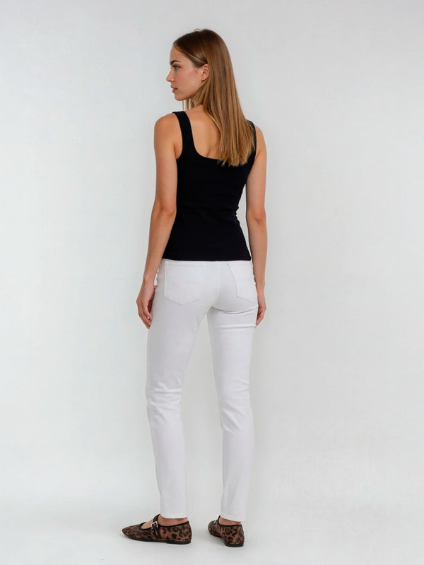 Der weiche Baumwoll-Mix sorgt für ein angenehmes Hautgefühl, während der Stretchanteil Bewegungsfreiheit und Formstabilität gewährleistet. So sitzt die Jeans perfekt, ohne einzuengen. Die weiße Farbgebung verleiht ihr eine frische, elegante Ausstrahlung und macht sie zum vielseitigen Kombipartner für jede Jahreszeit, ob mit Bluse und Blazer für den Business-Look oder mit Sneakern und T-Shirt für ein sommerlich-leichtes Outfit.